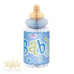 Add a whimsical accent to the party table at the next boy baby shower with this Honeycomb Blue Polka Dot Bottle-Shaped Baby Shower Decoration. This adorable honeycomb decoration is shaped like a baby’s bottle and features “Baby” in blue and green letters on a light blue background. Place this Blue Polka Dot Baby Shower Decoration by party foods, on a gift table, or near a balloon bouquet for a cute and festive adornment.