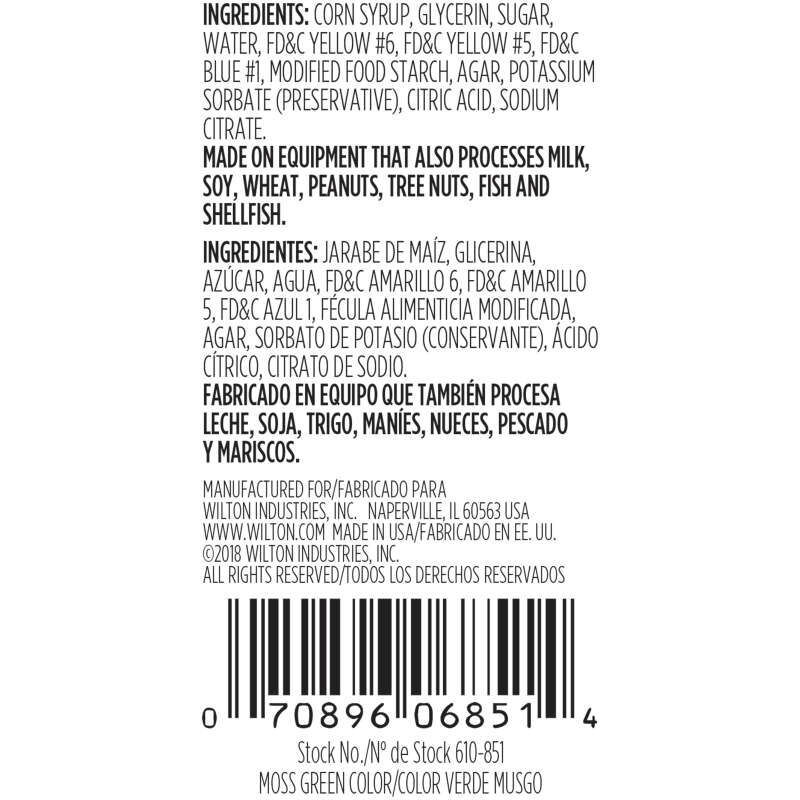 - Add rich color to your frosting, fondant, royal icing, dough, batter and more with this Wilton moss green gel food coloring